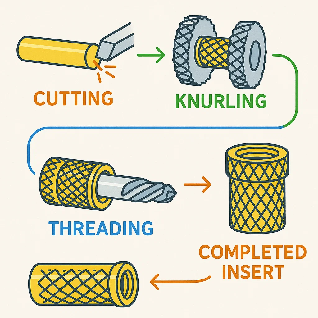 Injection Molding: A manufacturing process where molten plastic is injected into a mold cavity containing pre-positioned inserts, creating integrated plastic components with embedded threaded connections.